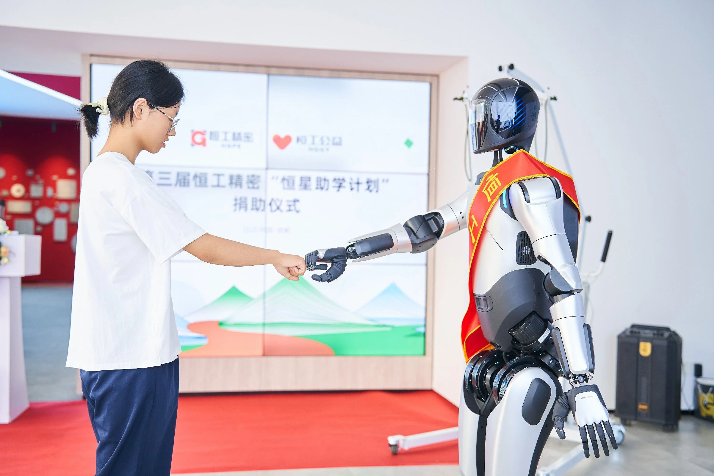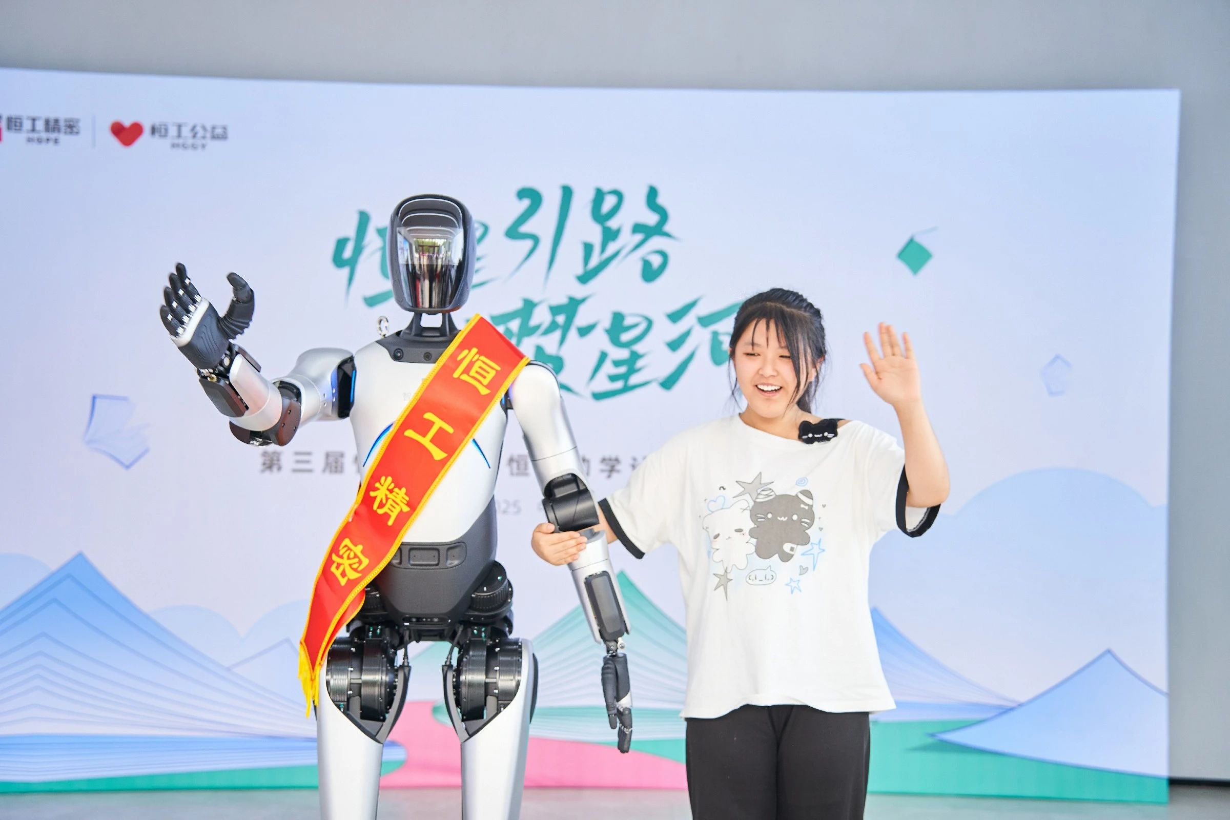 活動現場氣氛熱烈,儀式結束后,學子們走進企業智能化展廳,近距離觀察工業前沿領域核心零部件產品,與機器人進行近距離“人機互動”。恒工精密人形機器人在展示區靈活運轉,其精準的機械臂操作與AI交互系統令同學們驚嘆不已,切身感受到科技發展的澎湃力量。通過了解恒工精密打破國外技術壁壘,實現國產超越的奮斗歷程,同學們感受到中國制造業者在逆境中"千錘百煉終成器"的堅韌品格,表示進入大學后會努力精進學業,為我國邁向制造強國的事業做出自己的貢獻。